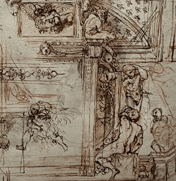 In fact the ceiling was so admired that Louis XIV wanted one too, and in 1667 sent artists to Rome to copy it. He had a replica of the Farnese gallery made in the Tuileries palace, and the full-size copies still exist, have been restored, and are also on show in the Louvre, together with a painting of how the copied version looked in the Galerie de Ambassadeurs at the Tuileries (which was destroyed in the fire of 1871). Today one can make beautiful copies of the ceiling with photos, and they have done that at the exhibition, indicating which parts exist in the form of sketches, but in the seventeenth century you had to send five artists to make huge drawings. And there they are in front of you, shadowy versions of the original.